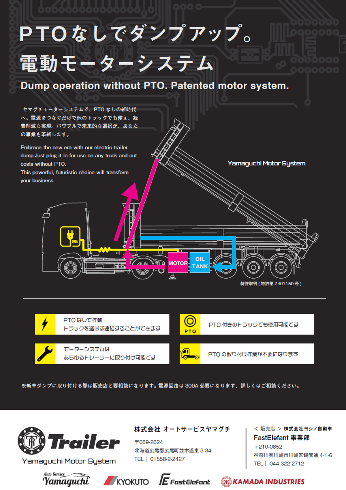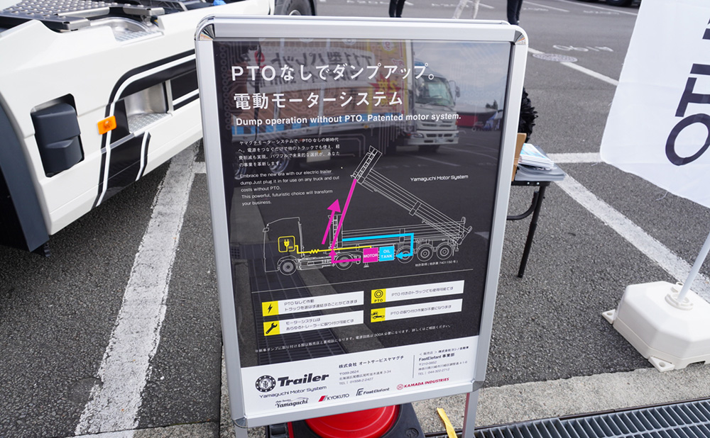 オートサービスヤマグチが開発した「電動モーターシステム」は、モーター駆動の油圧システムを搭載し、PTO(動力取り出し装置)なしでも荷台のダンプアップを可能にした革新的な製品です。これにより、トラクタの種類を問わず使用でき、PTO後付けの高額な費用や導入時の手間を削減します。